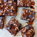 • Lift brownies out of the pan using the parchment paper and arrange on a serving tray. Top with chocolate frosting, caramel sauce, chopped pecans, flaky salt, and more chocolate chips.